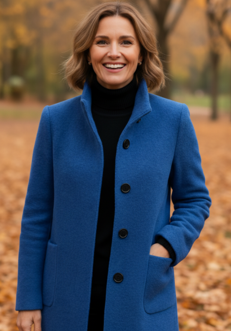 De jas heeft een rechte, flatterende pasvorm en een opstaande kraag die niet alleen een moderne uitstraling geeft, maar ook extra bescherming biedt tegen de wind. De hoogwaardige wolmix voelt zacht aan op de huid, houdt u heerlijk warm en behoudt zijn vorm en uitstraling, seizoen na seizoen.