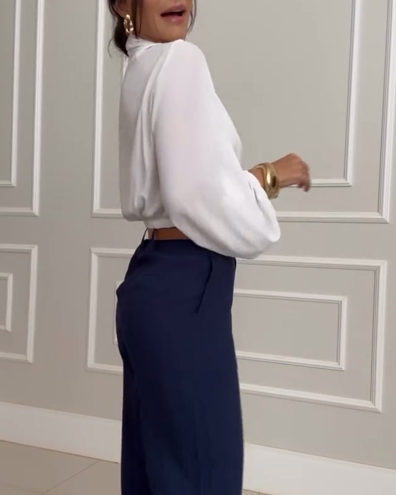 Mode effen kleur blouse met V-hals en lantaarnmouw