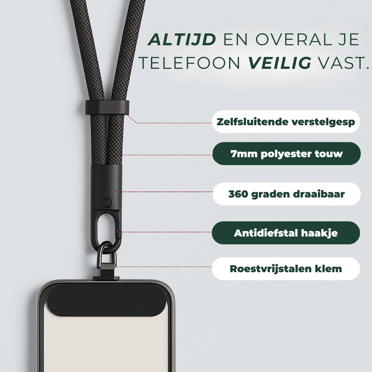 In drukke straten, op festivals of in het OV: zakkenrollers slaan razendsnel toe. Maar met dit anti-diefstal telefoonkoord geef jij ze geen kans.