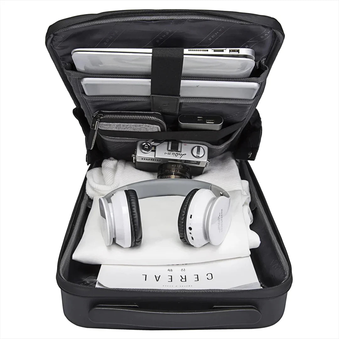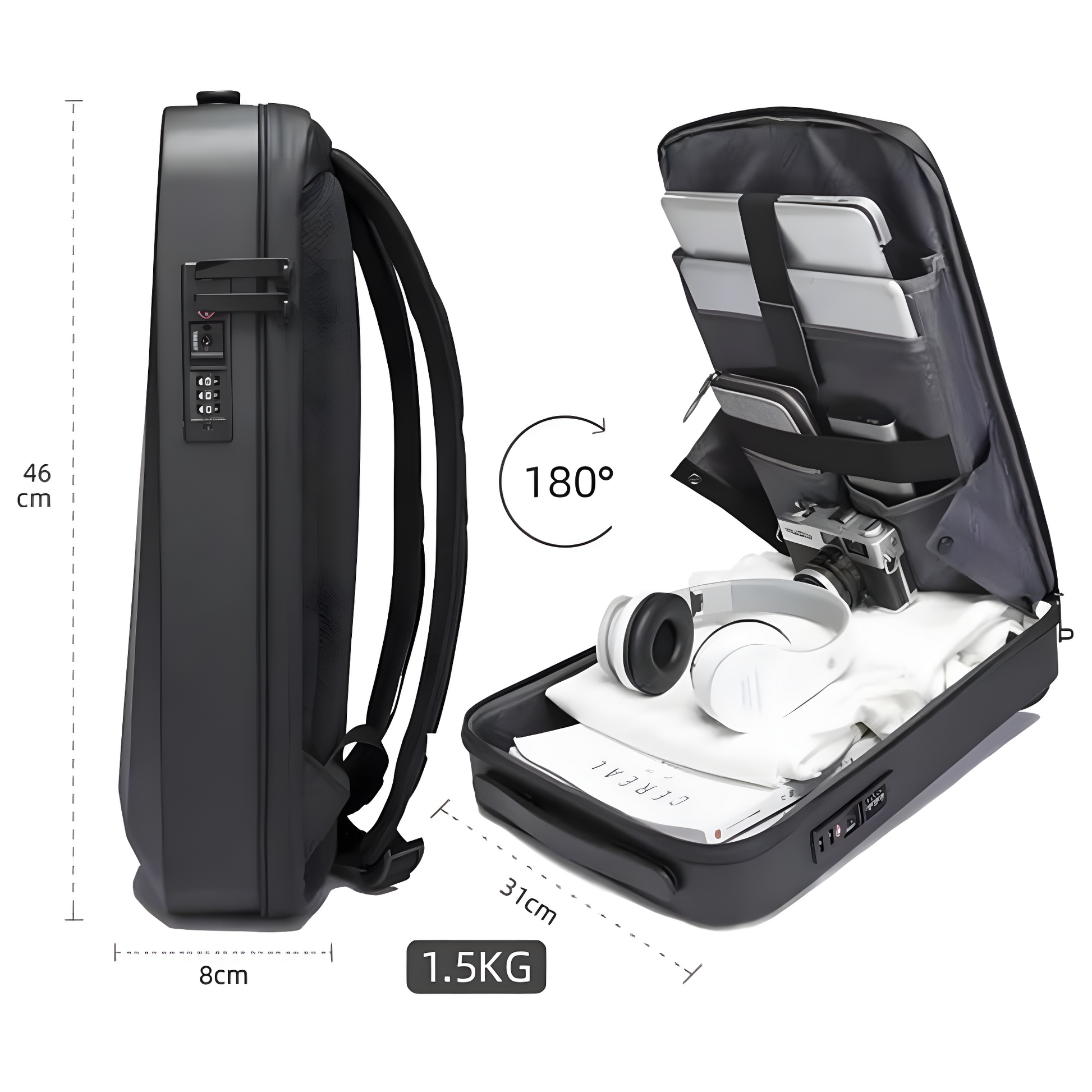 Deze rugzak is speciaal ontworpen voor reizigers, studenten en zakenmensen. Met een ultra-duurzame hardshell buitenkant en een 3-cijferig combinatie slot zijn je bezittingen veilig tegen diefstal en weersinvloeden. Geniet van gemoedsrust, waar je avonturen je ook brengen!