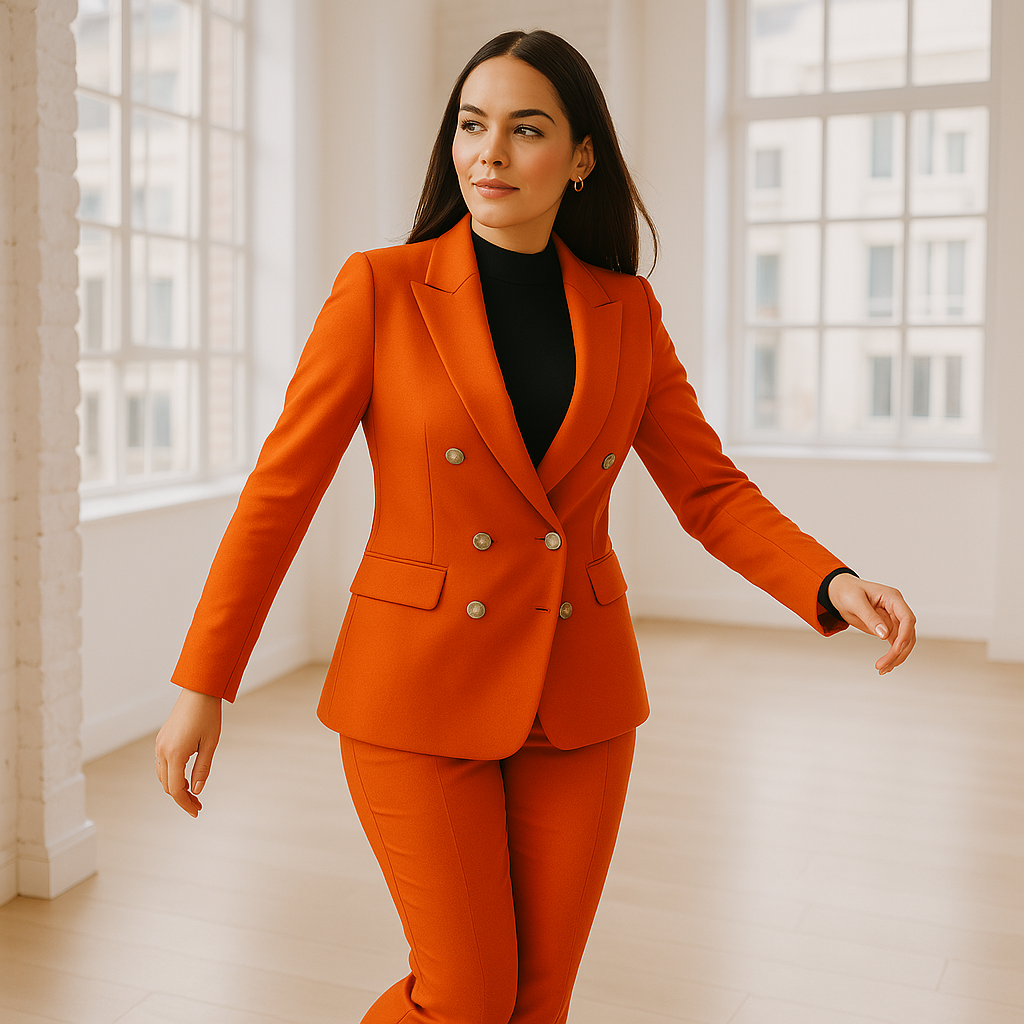 Afwerking: Dubbele rij gouden knopen, getailleerde pasvorm en nette broek met rechte pijp