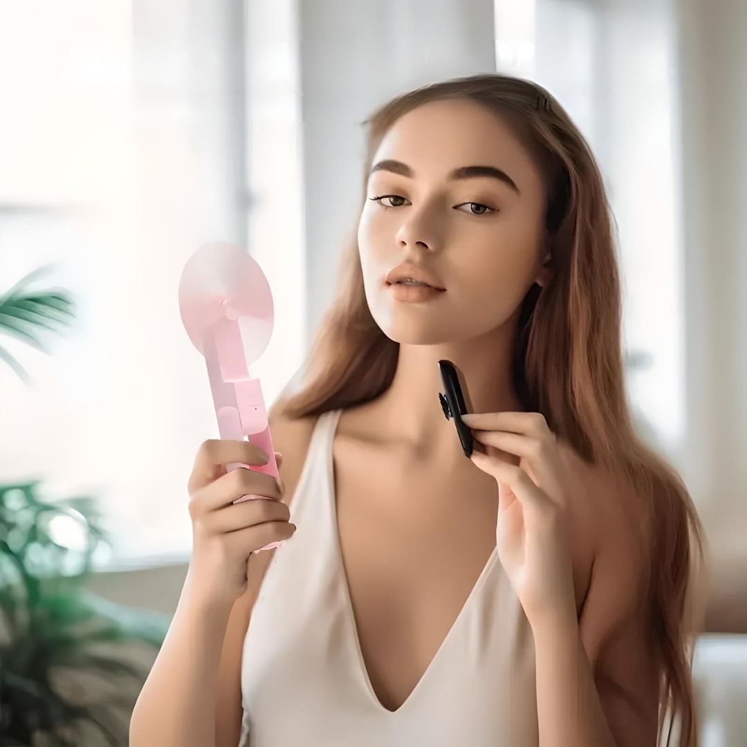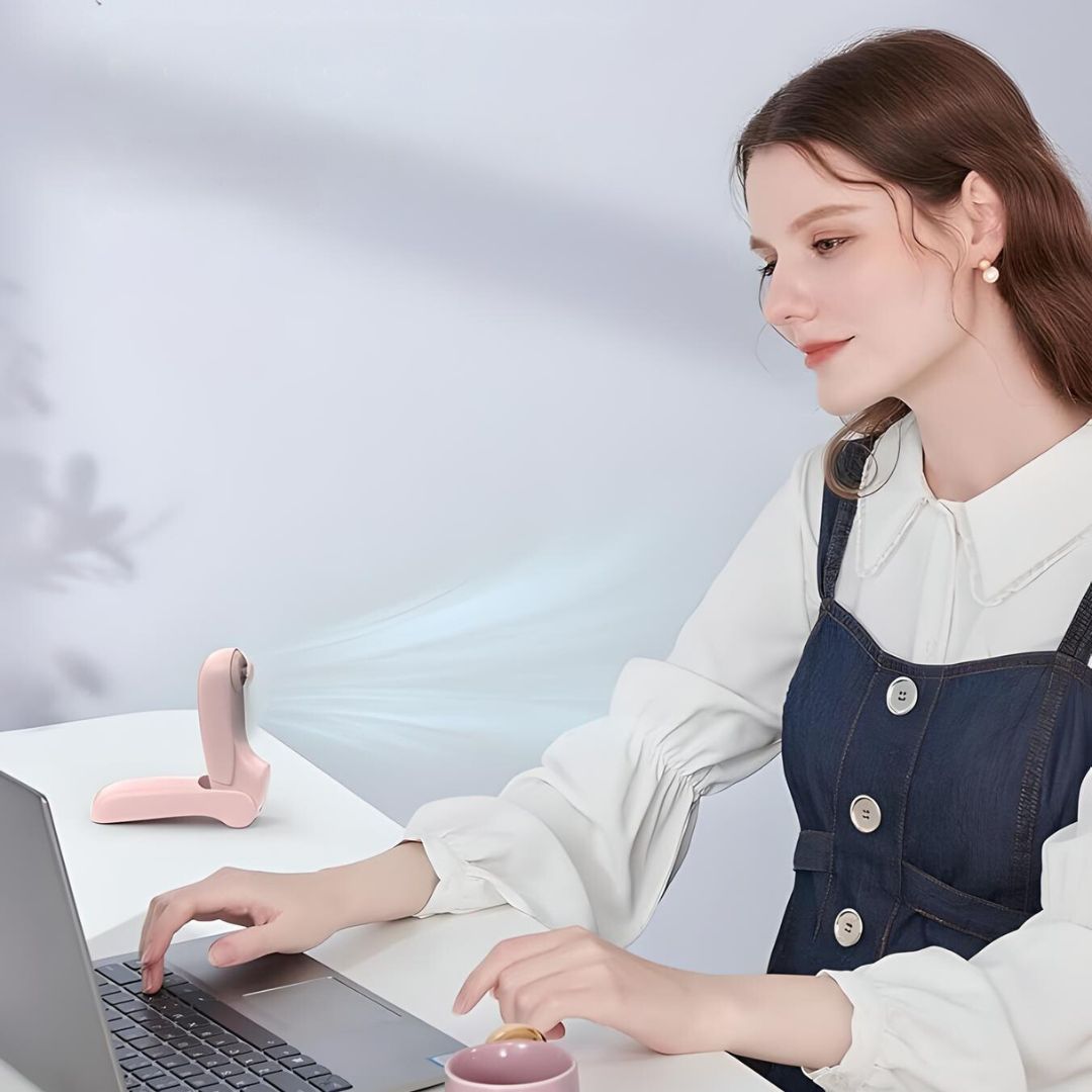 Het compacte en opvouwbare ontwerp maakt het gemakkelijk om in je handbagage, tas of handtas te stoppen, voor een verfrissende bries waar en wanneer je maar wilt. Gebruik het in de staande positie op je bureau of thuis om geld te besparen op airconditioning.