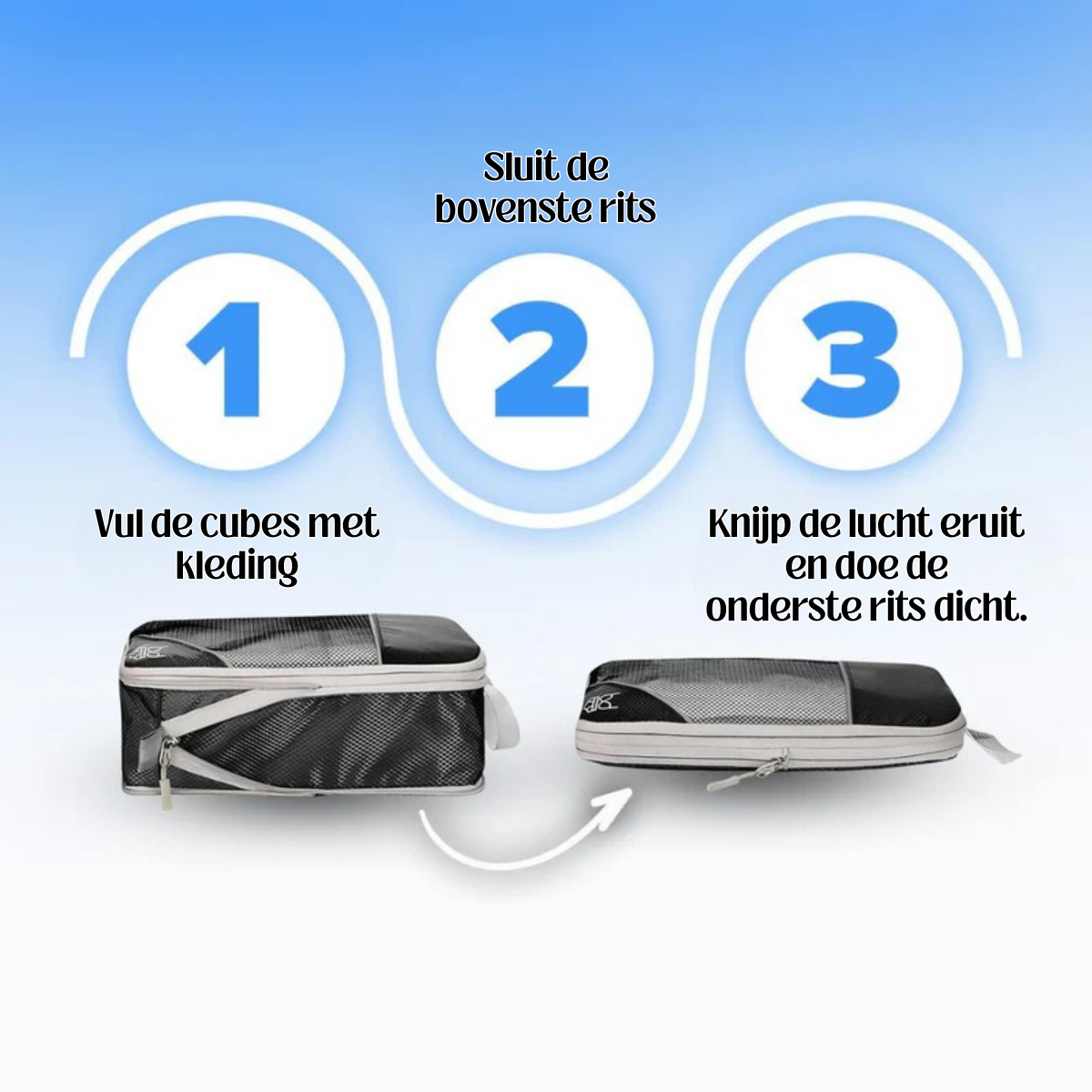 Overvolle bagage en op het laatste moment van outfit wisselen behoren tot het verleden. Met onze compressie cubes kun je tot 60% meer ruimte in je koffer besparen. Niet meer persen, geen stress meer, gewoon moeiteloos inpakken en meer ruimte voor wat belangrijk is.