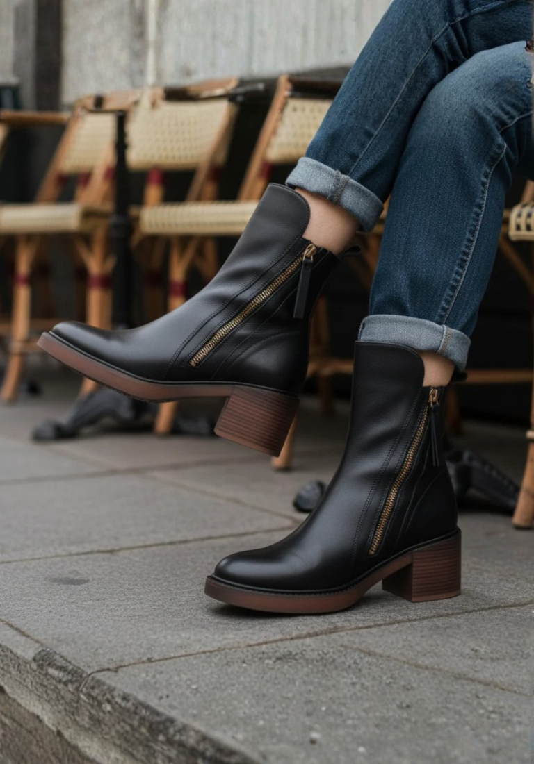 De Éclaire Enkellaarzen zijn gemaakt voor vrouwen die stijl en gemak willen combineren. Met hun zachte binnenvoering, stevige blokhak en verfijnde gouden ritssluiting voelen ze comfortabel aan bij elke stap. Het tijdloze ontwerp straalt rust en elegantie uit — perfect voor een verzorgde, vrouwelijke look in elk seizoen.